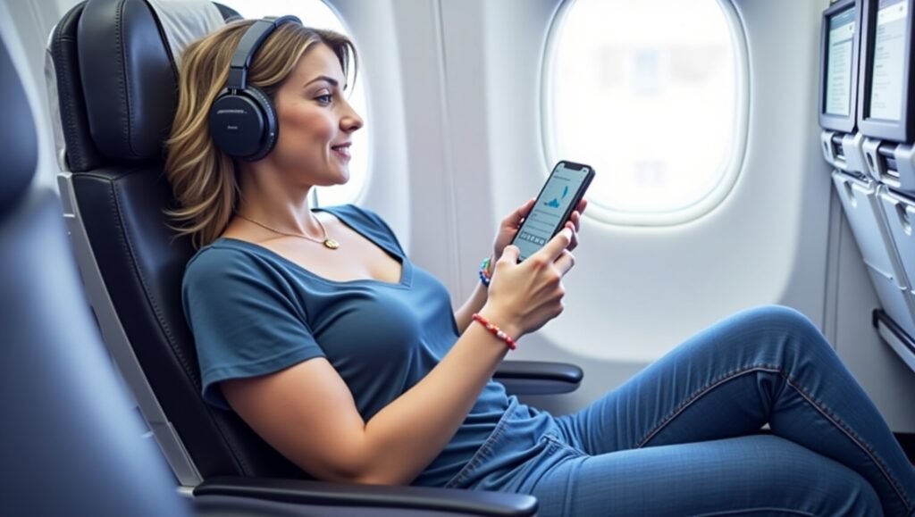 Use apps like Calm, Headspace, or the newer AI-guided NeuroSleep for mid-flight relaxation. Noise-canceling earbuds that double as sleep aids can play pink noise, guided meditation, or binaural beats.